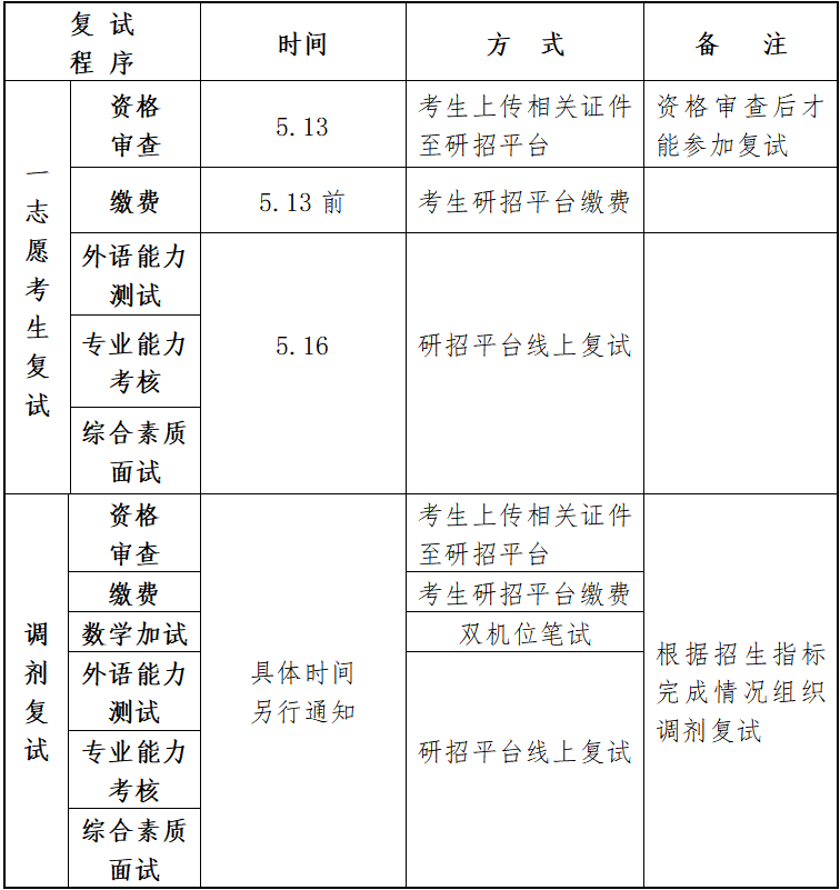 因本次采用远程复试方式,为保证复试顺利进行,学院将在复试前进行过程模拟和测试,具体测试时间及方式将在复试QQ群中通知(请关注)。