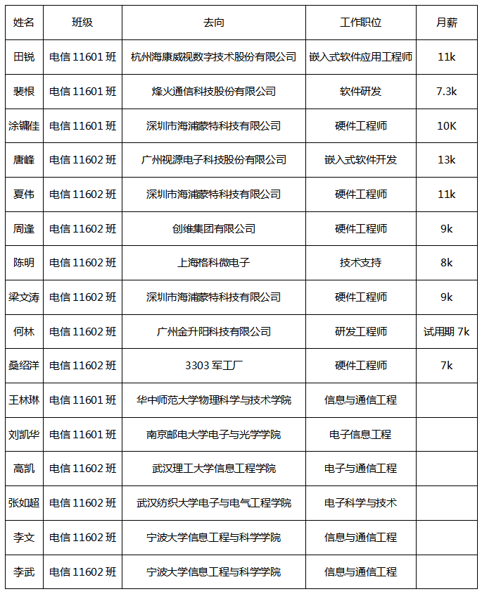 创新实验室这一届的同学拥有着扎实的专业知识和刻苦能干的品格。在2019年全国大学生电子设计大赛中,7个参赛队全部获奖,其中获得全国一等奖1项,打破了实验室最高获奖记录,是我校时隔10年后再次获得此项比赛国家级奖项,而且这一次是全国一等奖,更是零的突破,它必将激励着一届又一届的学弟学妹们发奋图强。在比赛结束后,实验室的同学一部分出去找工作,一部分选择继续求学深造。在今年就业形势依然严峻的情况下,实验室的同学们凭借扎实的专业功底和丰富的项目经验纷纷找到了较好的工作,他们普遍月薪在7000元以上,就业城市也多在上海、深圳等信息产业发达城市。他们就职多为软硬件工程师,且处于研发岗位,这也是实验室同学历年辛苦学习的结晶。