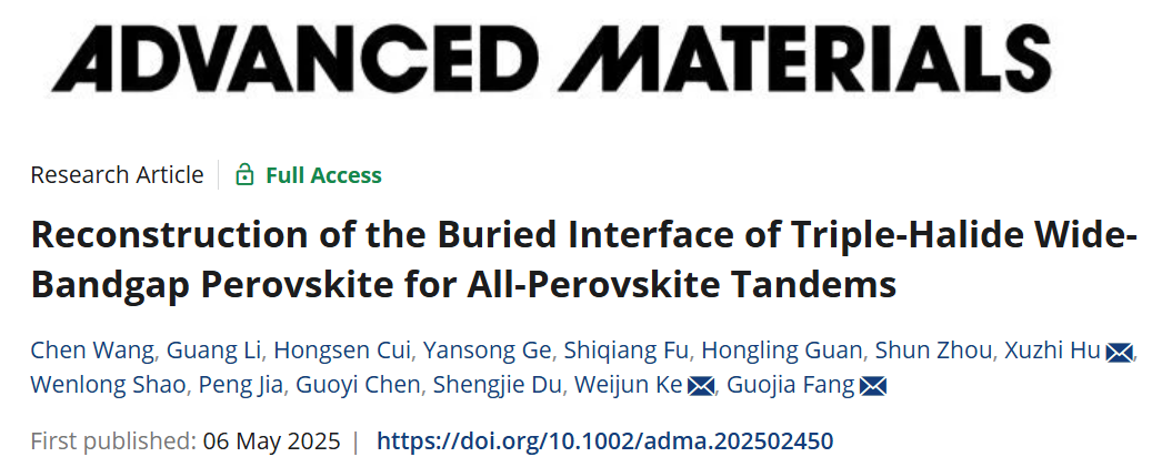 先进能源与未来显示技术团队在《Advanced Materials》上发表题为“Reconstruction of the buried interface of triple-halide wide-bandgap perovskite for all-perovskite tandems”的论文(论文链接: //advanced.onlinelibrary.wiley.com/doi/full/10.1002/adma.202502450)。女同