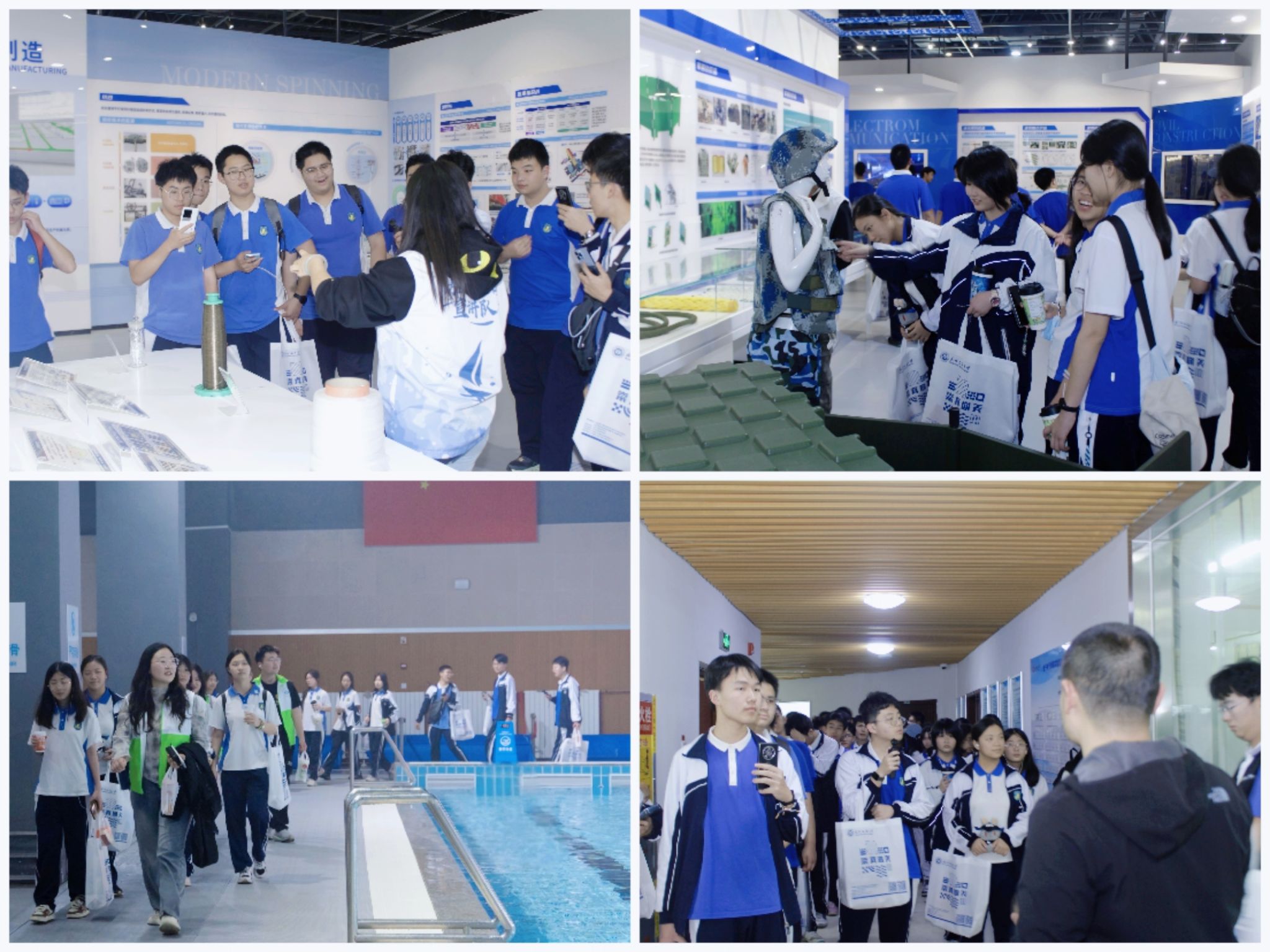 研学活动中,在电气学院师生志愿者的带领下,平冈中学学子们兴致勃勃地参观了纺织科技馆、全国重点实验室、女同