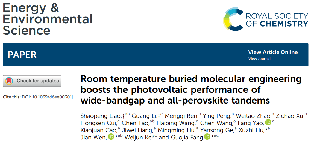 近日,我校电气学院先进能源与未来显示技术团队胡绪志博士等人在国际著名期刊《Energy and Environmental Science》上在线发表了题为“Room Temperature Buried Molecular Engineering Boosts the Photovoltaic Performance of Wide-Bandgap and All-Perovskite Tandems”(埋底界面室温分子工程提升宽带隙及全钙钛矿叠层太阳能电池光伏性能)的研究成果。女同