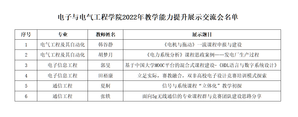 2022年教学能力提升展示交流活动在崇真楼A6013举行,活动由教学副院长韩谷静主持,胡梦月、田裕康等6名专业教师围绕一流课程建设、课程思政建设、学科竞赛、实践育人等主题作经验交流与分享。