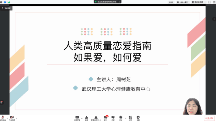 参加讲座的同学们认真聆听,积极在线提问、互动,“喜欢一个女生不敢表白怎么办”,“我和男朋友彼此喜欢对方,但就是经常吵架,很苦恼”,“异地恋该如何相处”…。周老师不时给同学们答疑解惑,并给出相应建议,“对于女生,你若盛开,蝴蝶自来;对于男生,当你想在草原上去追一匹骏马,发现特别困难时,不如更好的去种你的草原”。