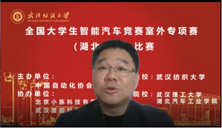承办,武汉理工大学、湖北汽车工业学院、北京小豚科技有限公司、武汉度因科技有限公司协办。全国大学生智能汽车竞赛室外专项赛组委会主任中国自动化学会副理事长侯增广研究员,全国大学生智能汽车竞赛秘书处主任卓晴,学校党委常委王栋教授,女同