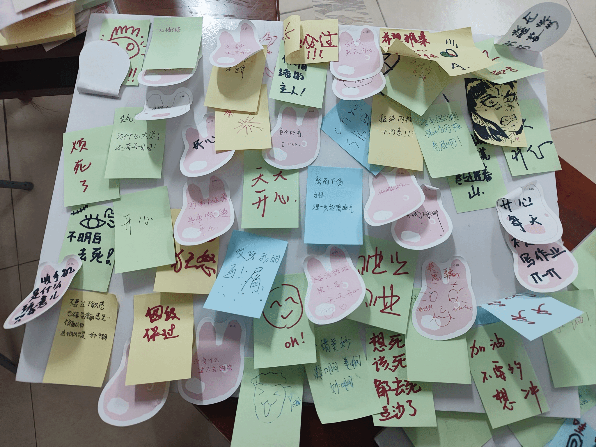 心理部为同学们准备了便签,彩笔和四块代表不同情感的板子,同学们可以在板子上用文字或者是绘画的形式记录下自己对于某一事物带有怎样的感情,完成的同学可以获得一份心理部准备的小奖品。活动开始时,大部分同学都只选择用简单的文字来表达自己的心情,但随着活动进行,越来越多的同学加入进来,开始有同学用简笔画甚至更精美的画来表达自己的情感。活动现场同学们踊跃参与,互动频繁,整场活动都保持着不低的热度直到结束。
