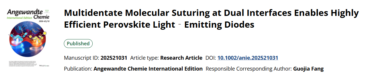 近日,我校电气学院先进能源与未来显示技术团队曹晓娟博士、姚方副教授等人在国际著名期刊《Angewandte Chemie International Edition》上在线发表了题为“Multidentate Molecular Suturing at Dual Interfaces Enables Highly Efficient Perovskite Light-Emitting Diodes”(多齿分子双界面缝合策略实现高效钙钛矿发光二极管)的研究成果(//doi.org/10.1002/anie.202521031)。女同
