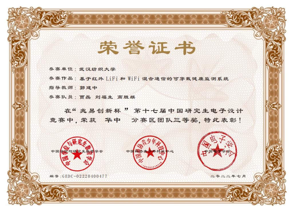 “通信与智能信息处理实验室”郭建中老师指导的参赛作品《基于红外LiFi和WiFi混合通信的可穿戴健康监测系统》,获得“兆易创新杯”第十七届中国研究生电子设计竞赛”华中赛区三等奖。