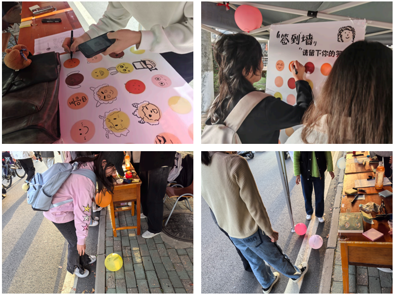 “减压互动区”里热闹非凡,成为了活动亮点之一。在“压力气球”环节,同学们将压力写在气球上,随着气球被踩爆,压力也随之一同释放。在“微笑打卡墙”前,同学们用五彩斑斓的笔触绘画笑脸,在艺术创作中释放压力、疗愈心灵,用灿烂笑容传递积极情绪。在“心理知识竞答”区域,同学们积极参与,在回答情绪管理技巧、心理咨询渠道等问题的过程中学习心理健康知识,不少同学赢得定制书签、绿植等精美礼品。