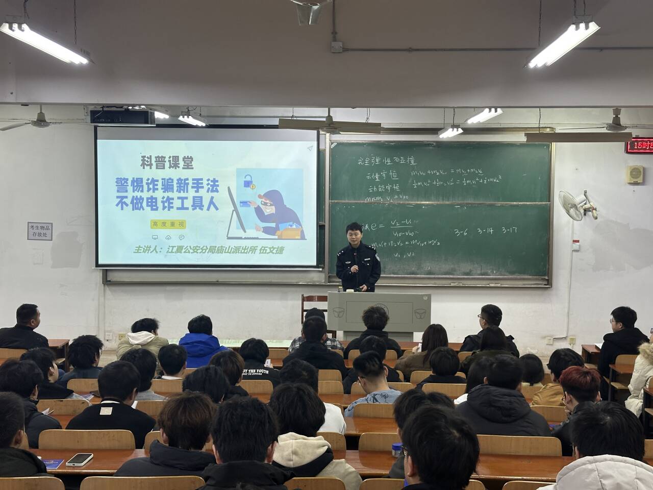 邀请江夏公安分局庙山派出所开展反诈专题宣讲。庙山派出所所长邱波、学校保卫处副处长马绪亮出席,学院全体辅导员、本科生、研究生学生干部、寝室长参会。