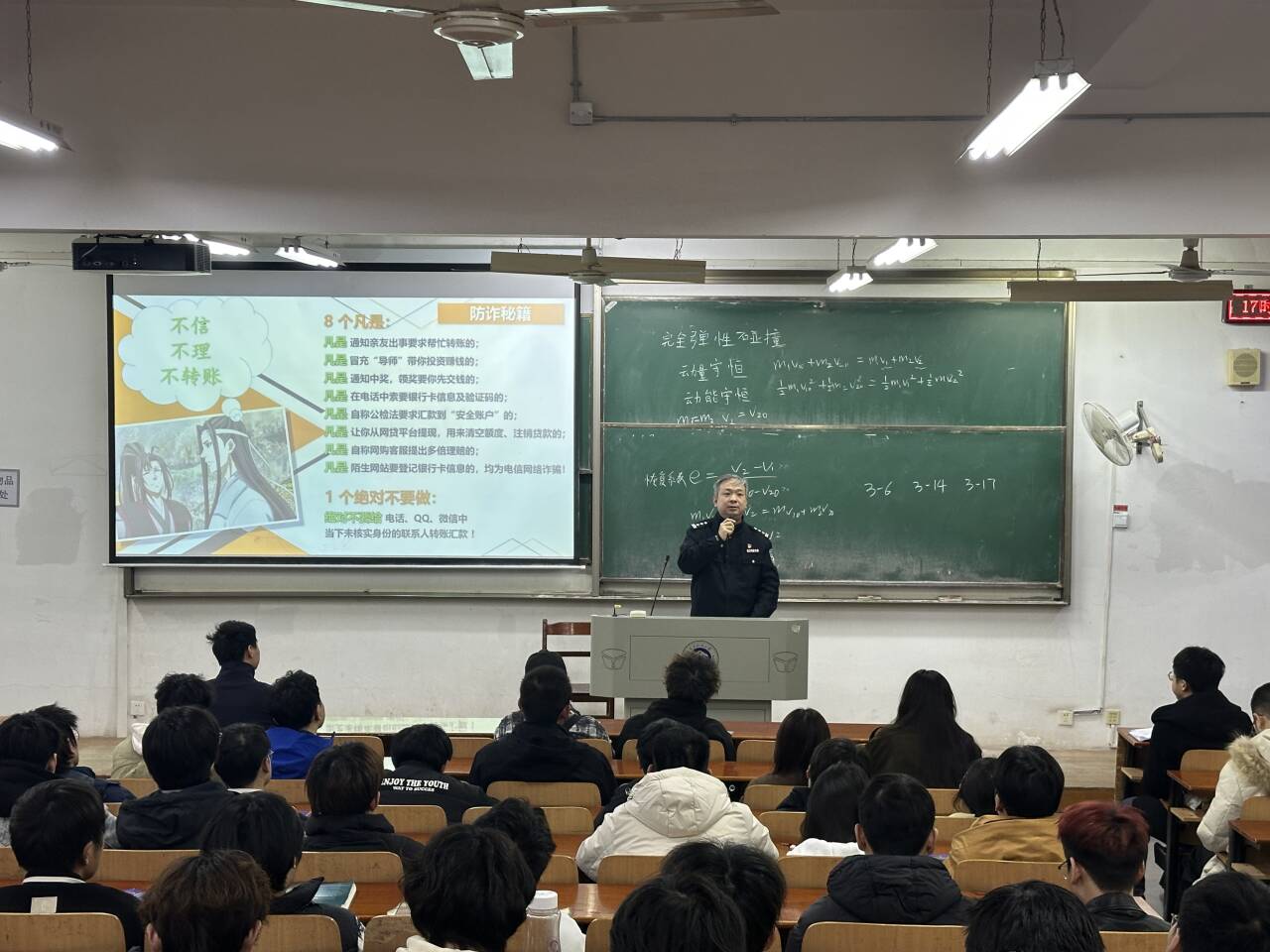 宣讲会上,邱波结合一线办案经验,用鲜活案例和通俗语言强调校园反诈的重要性,叮嘱学生时刻提高警惕,守护好个人安全,同时鼓励学生争做校园反诈宣传员,带动身边同学共同提升防诈能力。