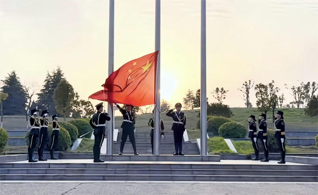 师生沐浴在晨光中,注视着国旗护卫队迈着铿锵有力的步伐走向升旗台。护旗手站立于升旗台四周,飘旗手紧握国旗末端,伴随着国歌的逐渐响起,那一抹绚丽的东方红在大家的眼中绽开。五星红旗冉冉升起,全体师生对国旗行注目礼。